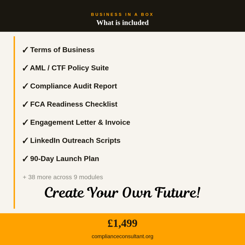 If you are a compliance professional building your own independent consultancy practice — or already trading but missing the infrastructure — the Business in a Box gives you the complete commercial and operational toolkit from day one.